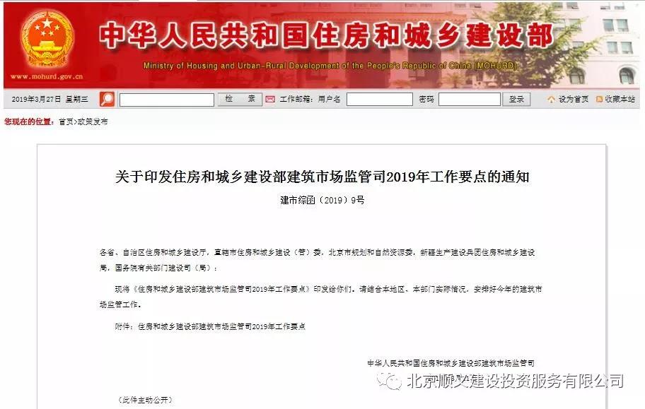 關于印發住房和城鄉建設部建筑市場監管司2019年工作要點的通知
